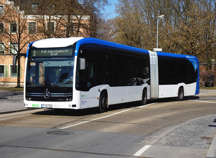 Seit Ende Januar werden die acht Exemplare vom Typ eCitaro G - die bei das Stadtwerk. Mobilität die KOM-Nummern 716 - 724 tragen - im Linienverkehr eingesetzt. Hier sehen wir Wagen 724 auf der Linie 3 an der Eisernen Brücke. © Regensburger Busse - regensburger-busse@web.de Für externe Links übernehmen wir keine Haftung. alle Angaben ohne Gewähr! |